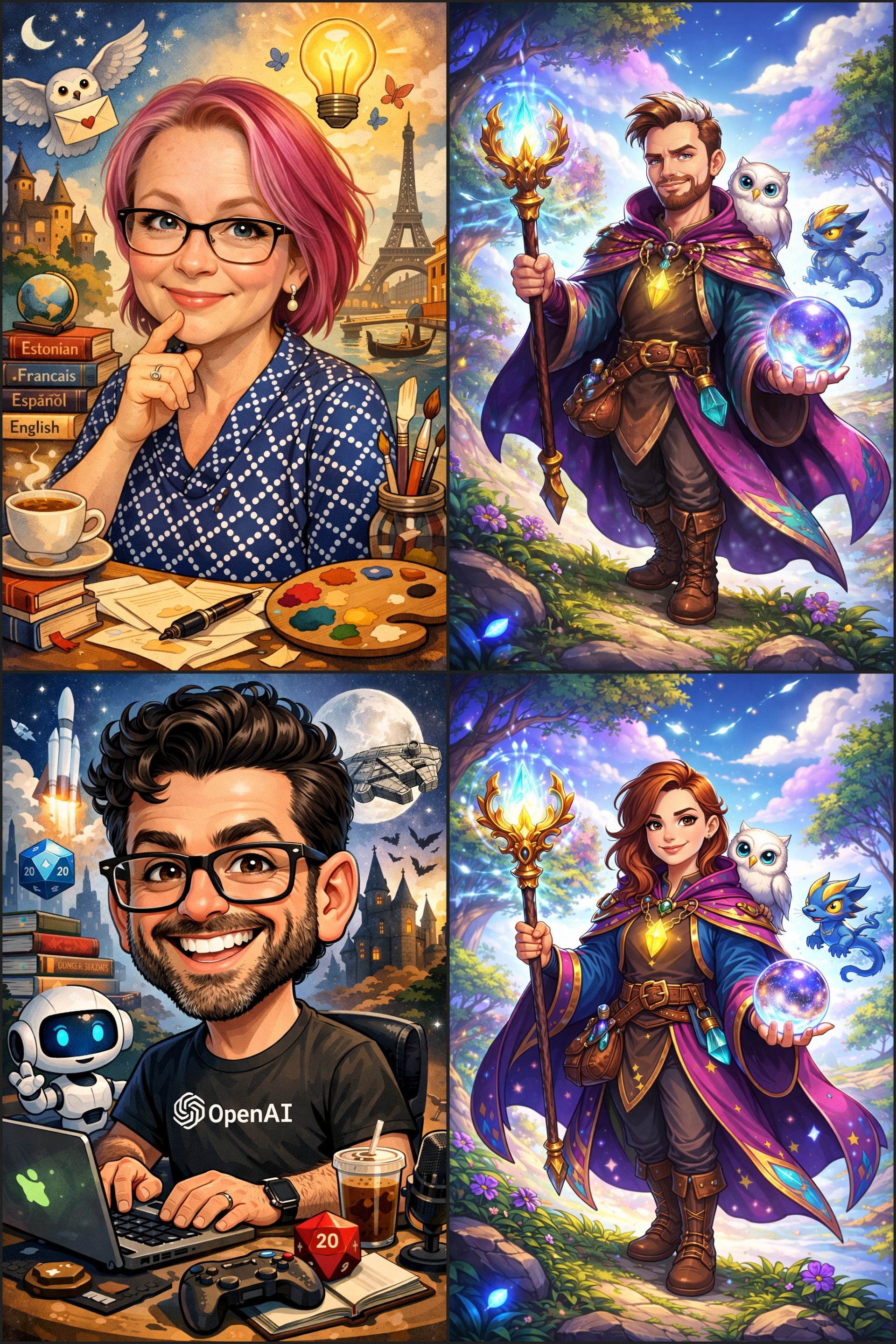 Siia lõppu veel üldise trendiga kaasa minemine, kui AI pidi sinust nende teadmiste põhjal, mis tal olemas, portree joonistama. Millegipärast sain kõigepealt mehe pildi, kes ilmselgelt Dragons and Dungeons mängust huvitatud 😂 Hiljem palusin fantaasiateemalist pilti, ning sain jälle kõigepealt mehe. Kui näitasin pilte oma mõne kuu pärast kolmeseks saavale pisikesele tüdrukule, siis mõlema naise pildi peale arvas ta, et täitsa “mamma”, mis natuke üllatas teise pildi juures (tema jaoks on hetkel kõik vanaema ealised naised mammad, kuidagi on ta oma pisikeses ajus selle nõnda paika pannud, ja minu süda sulab 😊).