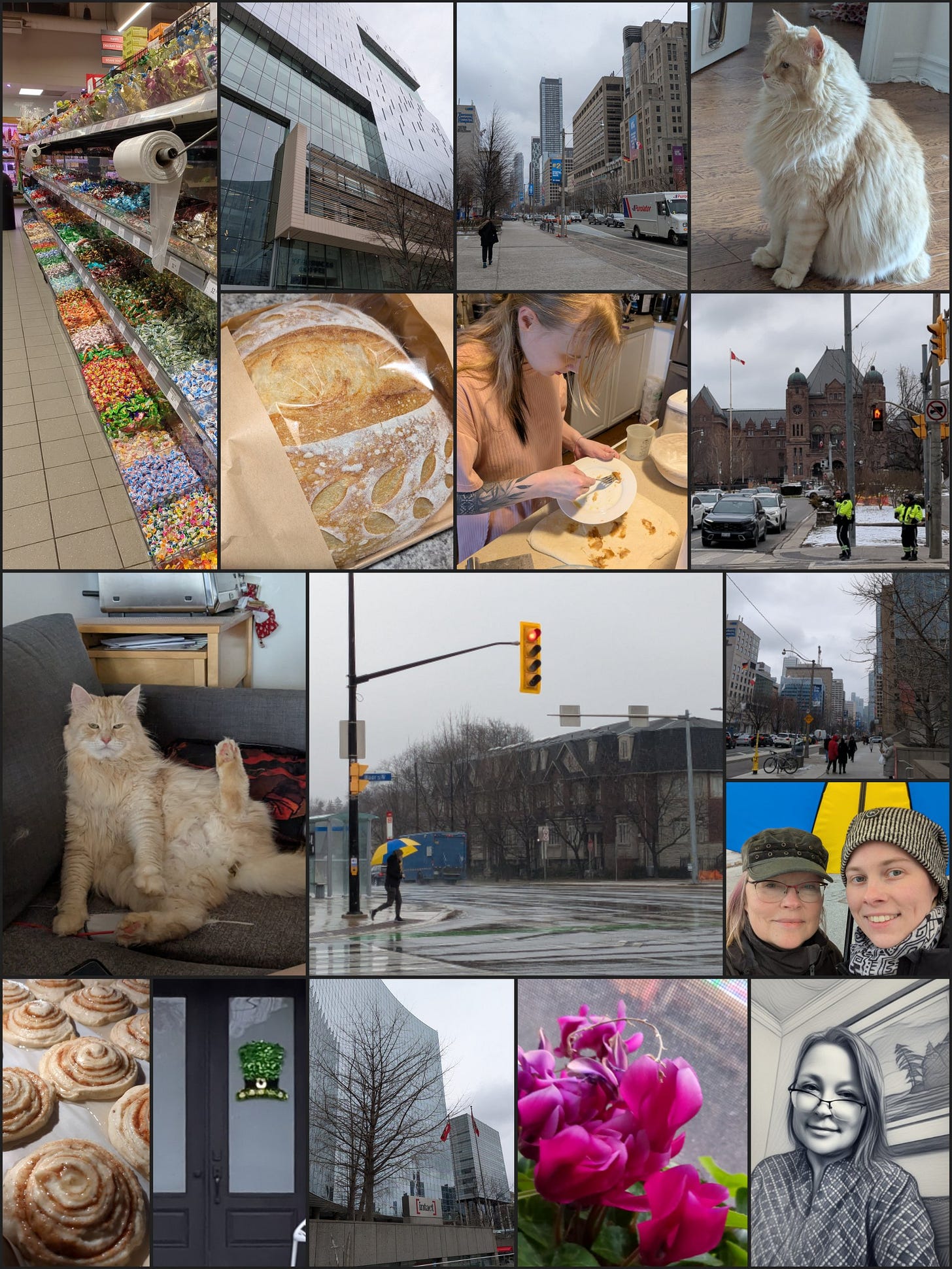 Seekord pikemalt ei heieta. Mul on olnud “vaba” nädal, sest kasupere Costa Ricas. Tõin nad pühapäeval kenasti täiesti tervena ja pisut väsinuna lennujaamast ära. Mul oli plaanis kassile valmis saada üks rippuv voodi, aga ei teagi, kuhu see aeg kadus. Pean ütlema, et ei kahetse. Sest vahel on niisama olemine ka super hea! Linnas pidin käima, nii et mõned fotod University avenüült, kus ridamisi haiglaid ja ka Ontario valitsushoone. Kirke kodus käisin, aitasin natuke, sest ta oli karates jala välja väänanud. Nii et pildid tema kassist. Kirkest on saanud ka usin haputaignaga küpsetaja. Teeb “klassikalisi” ümmargusi ja väikese mustriga. Kommvalik on poolakate poest Starsky.