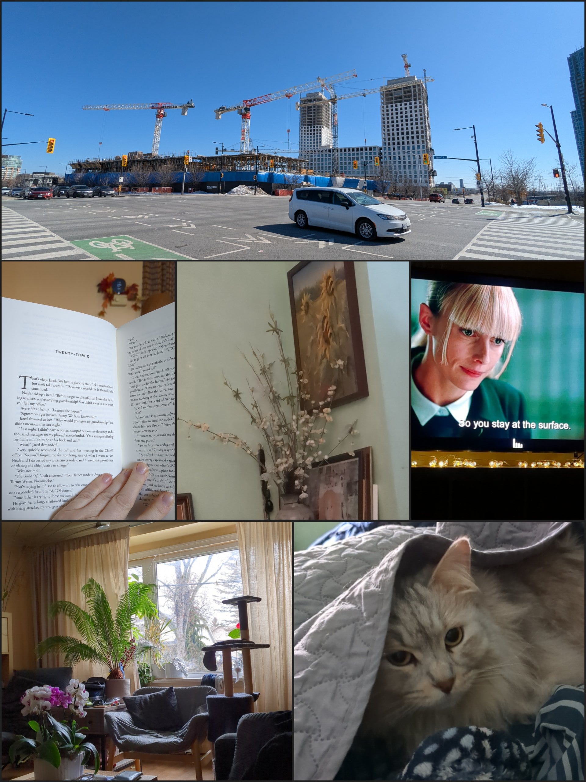 📸 Fotod sellest nädalast. Esmaspäeval käisin arsti juures. Päike sillerdas imeilusalt. Kevad on tulekul. Kuigi lume sulamine võtab omajagu aega. Ehitustöö metroo lõpppeatuse juures käib täie hooga. — Loen tavaliselt e-raamatuid, ja nüüd äkki oli mul üks paberraamat käes. Natuke ebamugav on lamades neid lugeda, pean ütlema. — Vaatasin prantslaste sarja Mõrv Pariisis. Peategelaseks kaks naist. Üks politseiuurija, teine (Astrid) töötab Politsei arhiivis ja on autistlik. Hästi huvitavalt üles ehitatud ja paneb jällegi omamoodi mõtlema sellele maailmale, kus me elame. Ja kuidas me omavahel suhtleme. Mõrvad on muidugi ka 😏 Britid on samast sarjast oma koopia teinud, tõesti lihtsalt koopia, nagu ma esimese osa põhjal aru sain. Soovitan jääda prantsuse versiooni juurde. — Kiisu käis mul seltsi pakkumas, kui ma haigena voodis vedelesin. — Pilt meie elutoast. Mul on natuke toataimi. Kunagi oli rohkem, aga leidsin, et hakkasid kuidagi liiga palju elamist üle võtma. Ning ma ei ole väga hea nende eest hoolitseja. Proovin ikka meeles pidada, et kord nädalas vett anda. Või kui nad liiga ära närtsivad. Siis on nende asi, kas jäävad ellu või mitte 😄