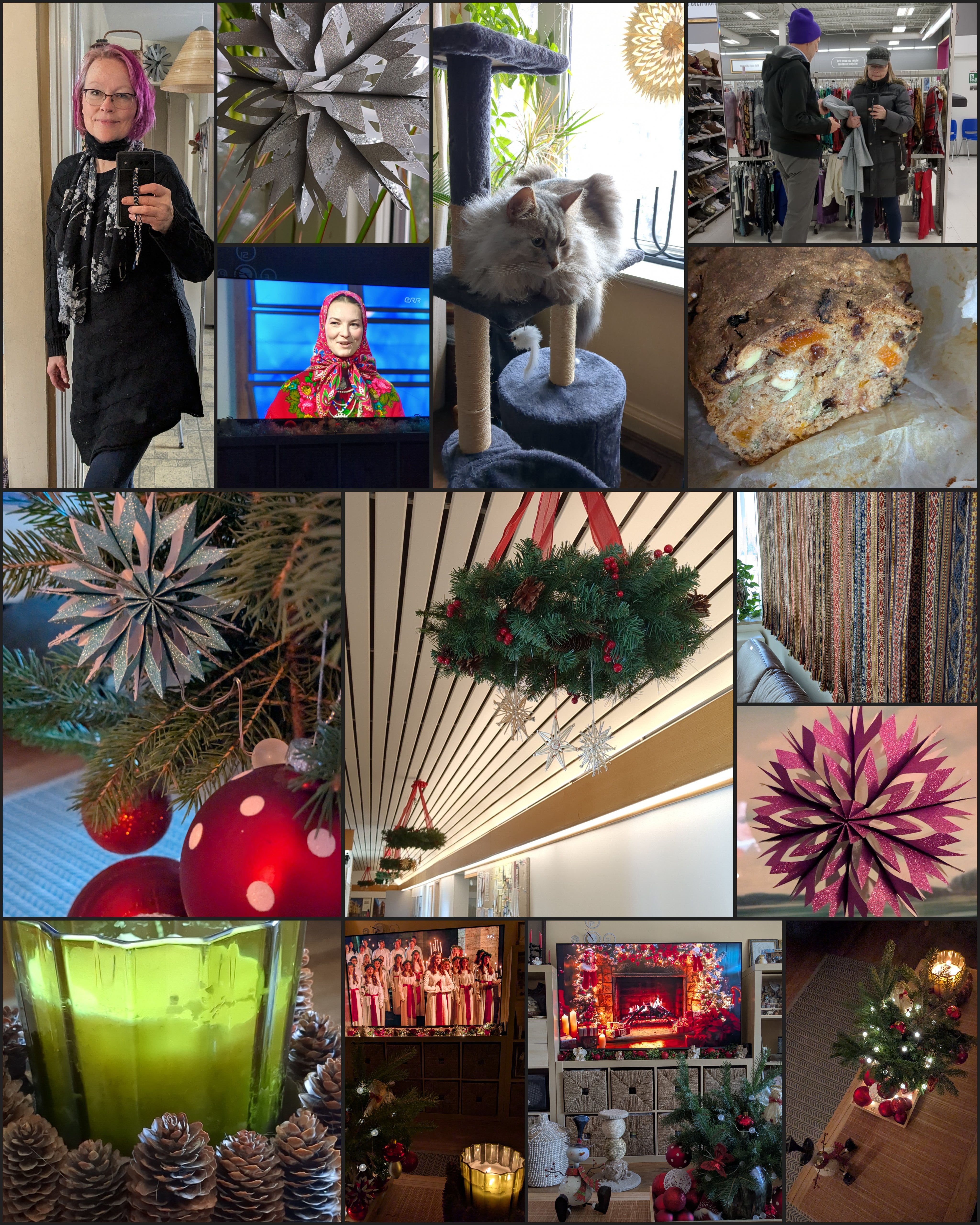 Allpool hulk fotosid jõulude teemal. Olen teinud paberist jõulutähti. Nii tore ja rahustav tegevus. Toomas vaatab ja läheb ainuüksi laua taga istumise mõttest üleni higiseks, sest ei suuda ju pudeliski paigas püsida. Mulle jällegi meeldib. Sest tulemus on alati nii kena. Hoopis teistmoodi, kui näiteks mõne küpsetise või tordiga jännates, kui ei tea enamasti, kuidas välja tuleb. Küpsetiste osas proovisin ühte huvitavat leiba, milles pole suhkrut, ainult rukkijahu (hästi natuke nisujahu) ja palju pähkleid-seemneid, pluss kuivatatud puuvilja. Väga hea kiire näks. Jõulune kaunistus laes on Läti keskusest ja selle kõrval läti rahvarõivaste vööd kõik reas seinal. Tahaks väga, et meie uues keskuses oleks rohkem selliseid rahvalikke kaunistusi. Eesti Majas ju õieti neid polnudki. Üks pilt uuskasutuskeskusest, sest nüüd ma olen pensionär ja pole raha vaja niisama kulutada 😉 Ja üks foto telepildist, kus kuulan Silvia Soidega intervjuud Anu hommikusaates. Ta tuli ju Vancouverist Tartusse ja on olnud Kihnus pikalt. Ning kõige lõpuks mõned fofod kodust. Kus mul on jälle ainult mõned väikesed kuuseoksad jõulutunnet loomas. Kõige vähem, mis mul kunagi olnud. Peaaegu mõtlesin, et ei panegi neid, sest olin lihtsalt mõned punased jõuluehted kandikule pannud ja teleka ette tuled ja inglikesed. Aga ikkagi kena vahelduseks rohelist tuppa saada.